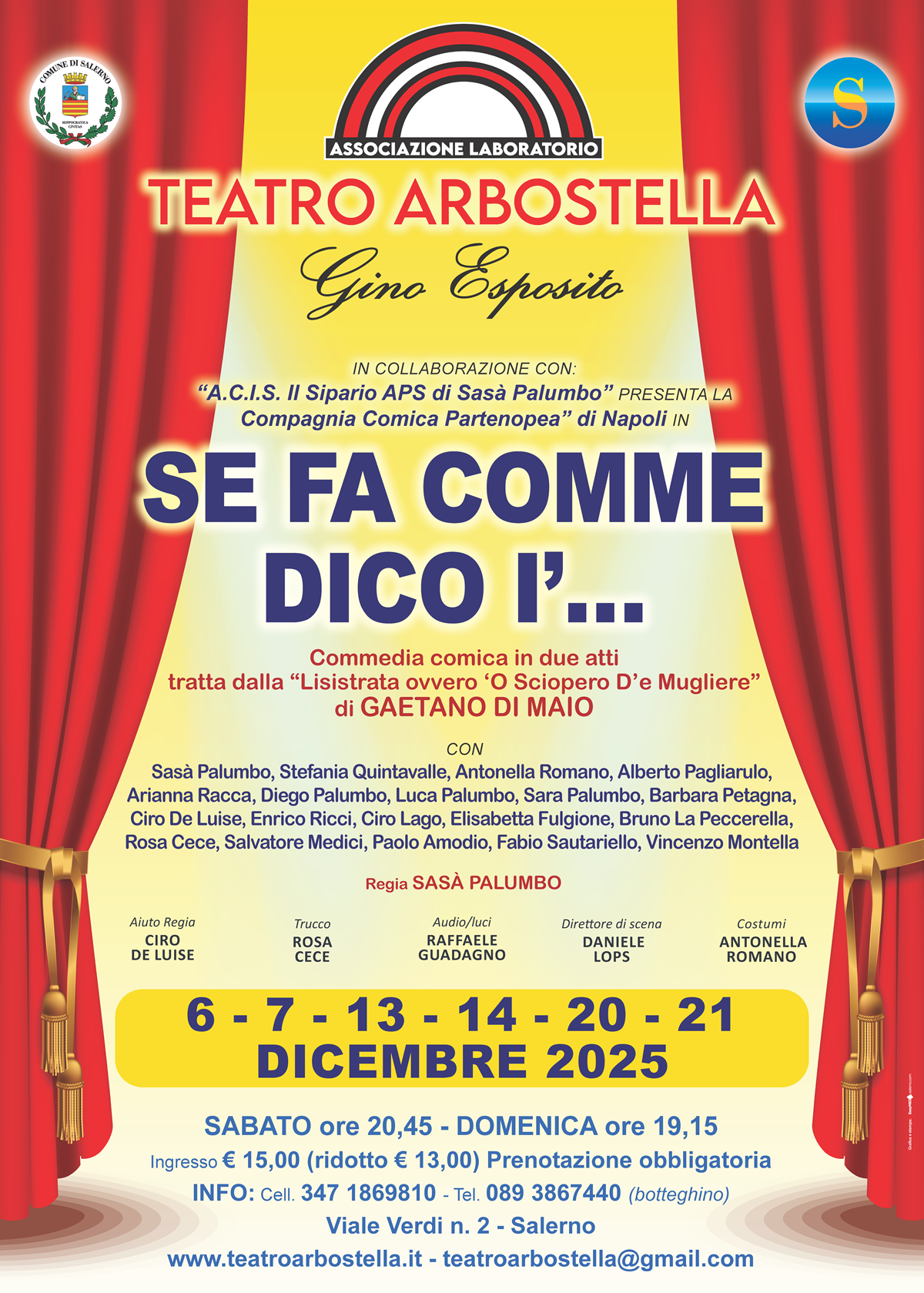 Protagonista dei primi tre weekend di dicembre sarà il noto attore, autore e regista Sasà Palumbo, con la sua compagnia Acis il Sipario, che porterà in scena la brillante commedia “Se fa comme dico i…”, adattamento moderno e comico della celebre Lisistrata di Aristofane, rielaborata su testo di Gaetano Di Maio.