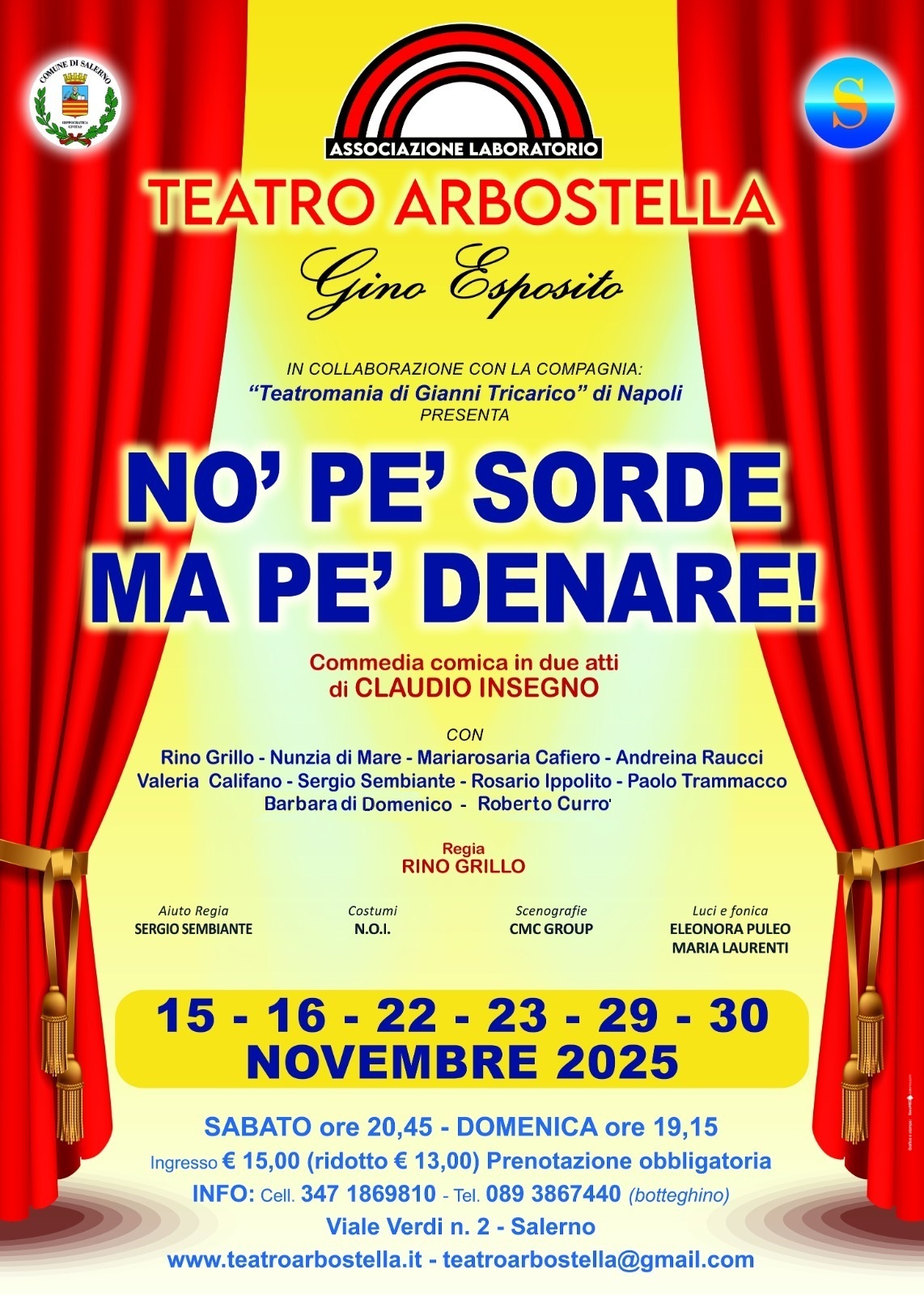Da sabato 15 novembre, per tre weekend consecutivi, sulle tavole del palcoscenico di Viale Verdi arriva un’altra compagnia ormai di casa: la Teatromania di Gianni Tricarico di Napoli. La compagnia si cimenterà con l’originale commedia brillante “No pe’ sord ma pe’ denare”, un testo di Claudio Insegno (fratello del celebre Pino) per la regia di Rino Grillo.